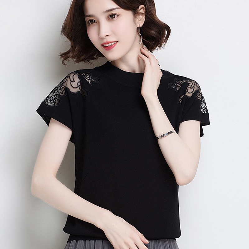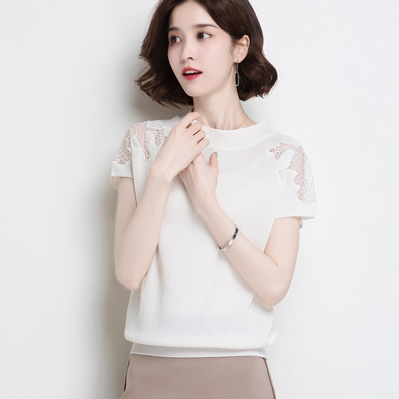 法式刺繡網紗蕾絲短袖女上衣,夏季新款冰絲針織衫薄款洋氣T恤!